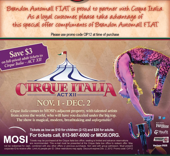 November 24th, 2012Definitely take advantage of this great discount from Joe’s friends at Brandon Automall Fiat. The Ed Morse family of dealerships are always supporting community events. … And Joe definitely recommends these “Cirque” shows, too. Great entertainment without annoying challenge flags.