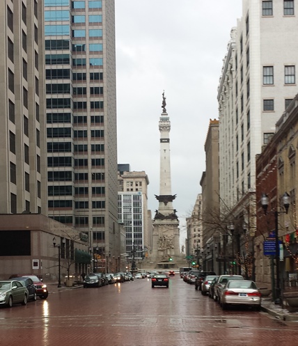 The Soldiers’ and Sailors’ Monument in Indianapolis at night, two blocks from Joe’s hotel. The monument, located in the middle of aptly named “Monument Circle,” is the true center location of the city in the heart of downtown. It honors all Indiana war veterans killed in action prior to World War 1.