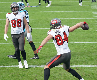 After a 2nd-and-6 catch for a first down in the second quarter, Brate re-emerged on 3rd-and-19 at 6:20 remaining in the third quarter with the Bucs leading 26-17 at the Panthers-42. It was a big play, and Brate delivered with 12 yards of YAC (yards after catch) following a short reception. The exclamation point was a leaping dive for the first-down marker while two Panthers drilled him at the knees.