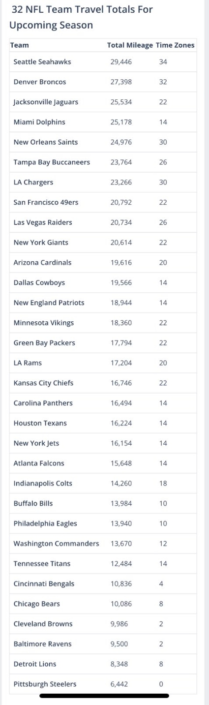 The disparity on that list is pretty incredible. It’s amazing how little the Steelers will travel compared to The majority of teams. Has to be an advantage of some kind.