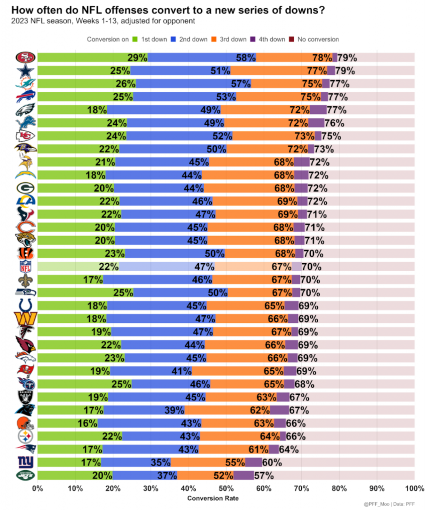 The PFF tribe has a chart documenting each team’s ability to convert and move the chains on each down, first through fourth.