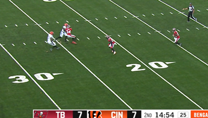 Second-year receiver Trey Palmer got his shot as a punt returner last night and was handed a heck of an opportunity early in the second quarter. (See screenshot above.) Palmer caught the ball at the Bucs’ 15 yard line and had all kinds of green space to his left for him to unleash his special speed. Instead, Palmer pulled a Rachaad White; he hesitated and ran right, trying to squeeze between his two blockers.