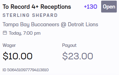 *Bucs wide receiver Sterling Shepard has caught 4 balls in half of the Bucs’ games this year. He seems primed for a good number of targets tonight, and to get open against an inexperienced Lions defensive backs group. Joe also thinks a wide receiver screen or two is coming Shepard’s way. Joe likes the +130 here.