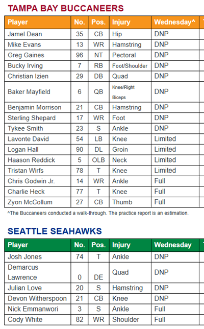 Newcombers to the Bucs’ report are receiver Sterling Shepard (foot), Tykee Smith (ankle) and Zyon McCollum (thumb).