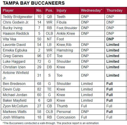 Seventeen active players are listed with injuries on the Buccaneers’ official Thursday report.