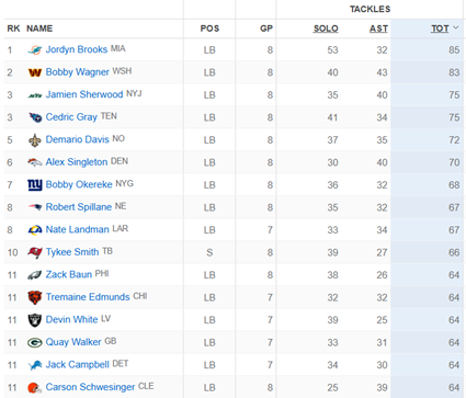 Dennis has 59 tackles (41 solo) – only 1 player on this list has more solo tackles