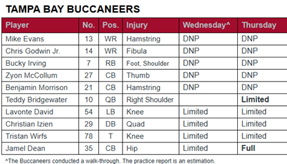 The full Thursday Bucs injury list is below. The team did not practice (again) today, only a walk-through session at One Buc Palace.