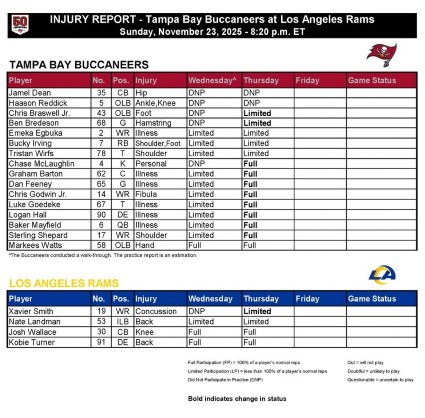 November 20th, 2025The Bucs’ injury report was pretty gnarly yesterday with the flu bug biting so many Bucs, including Bucs quarterback Baker Mayfield.