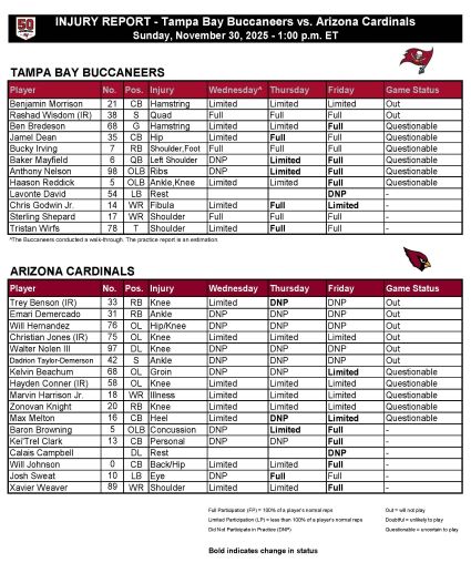 Fun facts: Today, Bucs great and Super Bowl champion Simeon Rice will have his name inducted into the team’s Ring of Honor. … Arizona QB Jacoby Brissett passed for 317 yards and a touchdown last week. Brissett has passed for at least 250 yards and a touchdown in each of his six starts this year. Brissett leads all quarterbacks with 175 completions and 1,985 passing yards since Week 6. … RB Bam Knight looks for his third game in a row with a rushing touchdown. … WR Greg Dortch aims for his fourth straight game with a touchdown. … TE Trey McBride is tied with Jimmy Graham for most catches by a tight end in his first four seasons. McBride is currently tied with Larry Fitzgerald for most consecutive five-catch games (13) in Cardinals franchise history. … OLB Josh Sweat has a sack in three of his last four games. … S Jalen Thompson tied for team-high nine tackles and had a sack, pass defensed and forced fumble last week. … S Budda Baker co-led the Cardinals with nine tackles and his 10th career sack. Baker also had a pick and a pass defensed last week. … Bucs QB Baker Mayfield has a touchdown pass in 10 of 11 games. Ranks fifth in the NFC with 18 touchdown passes. … RB Sean Tucker has 50 yards rushing in two of his last three games. … WR Emeka Egbuka ranks first among rookies in touchdown catches (6) and 2nd in receiving yards (749). He has at least 100 receiving yards and a touchdown in 2 of his past 3 home games. … OLB YaYa Diaby had his fifth sack last week. … ILB Lavonte David has a tackle for loss in three of his last four home games. Co-led Bucs with 8 tackles and a tackle for loss in a blowout loss in Los Angeles. … S Tykee Smith aims for his fifth game in row with a pass defensed. Smith has at least five tackles in every game this year. He currently has 66 tackles.
