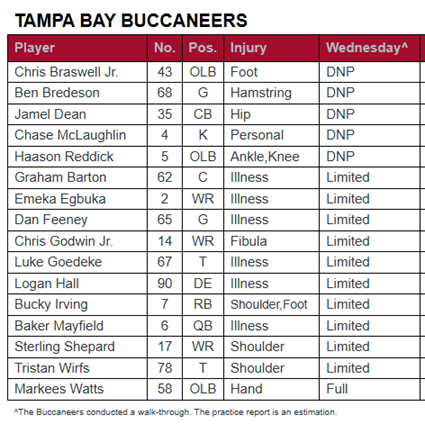 The Bucs had a walk-through session yesterday. That means the official listings below are estimations — who would have practiced if the team actually did.