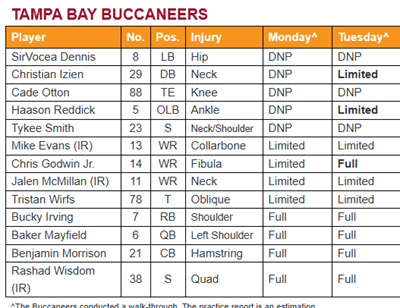 Other injured Bucs were either limited or full-go. Receivers Mike Evans and Jalen McMillan, both officially on injured reserve, were limited, as was Christian Izien (neck) and Haason Reddick (ankle).