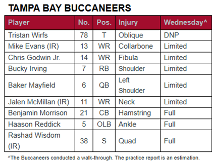 Chris Godwin (fibula) and Bucky Irving (shoulder) remain on the report and were listed as limited along with Baker Mayfield (left shoulder).