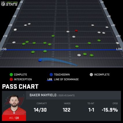 I won’t pretend to be a football expert, or anywhere close, but it looks like Mayfield’s avg depth of target went up from 7.07 in 2024 to 8.48 so far in 2025. And his TD to interception ratio went up from 2.6 to 3.3. That doesn’t sound like a QB who’s dragging down his team, and I haven’t seen anything that suggests he’s quitting on anyone.