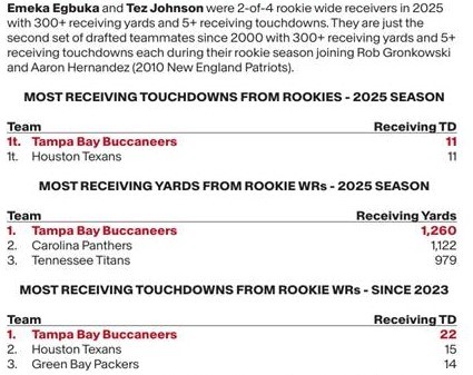 No team in the NFL had more receiving yards from a pair of rookies like the Bucs did. And no one had more touchdowns from the same pair of rookies in 2026 than the Bucs. Houston also had 11 touchdowns from two different rookies this past season.