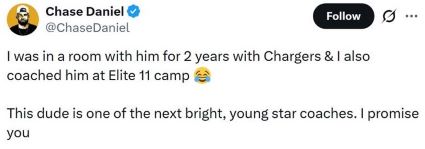Daniel worked with Whitmer when the future Bucs assistant was a camper at the Elite 11 camp, which is only for the top quarterback prospects in high school. A few years later, the tables were turned. Whitmer was an offensive assistant with the Chargers and Daniel was backing up Justin Herbert.