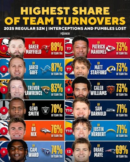 For example, last year Mayfield had 11 picks and 11 fumbles. In 2024, Mayfield led the NFL in picks (16) and fumbles (14) yet threw for 4,500 yards (third in NFL) and was second in the NFL in touchdowns (41).