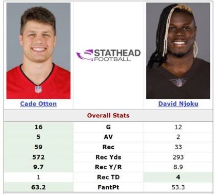 The first thing that jumped out at Joe is that Njoku is 29. Uh, oh. Then, Joe looked at his numbers from last year. Otton had far better numbers except for touchdowns (Njoku had four to Otton’s one).