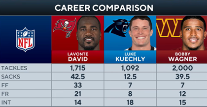 CBS also shared the graphics above and below on David. They’re impressive, and they don’t include his stunning tackles for loss total, which may be David’s greatest case for the Hall.