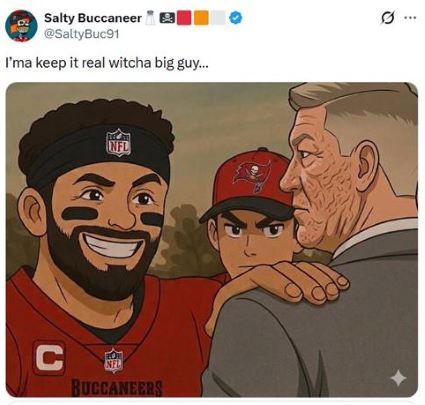 Joe’s professor loved the examples. In that same way, Joe loved @SaltyBuc91’s graphic of Baker Mayfield thanking Licht for having his back publicly while a Bucs fan stands in the background and scowls, offended with his words. The graphic perfectly captured how Bucs fans responded to Licht’s messaging for his players this week.