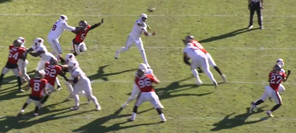 Logan Hall fought his way off the turf yesterday on this play to force a fumble from No. 20, Cardinals running back Bam Knight, as he entered Hall’s gap.