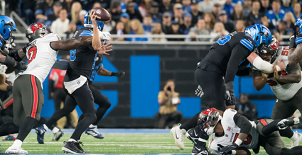 Haason Reddick looks on as YaYa Diaby strip-sacks Lions QB Jared Goff last night.