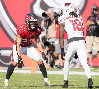 Cornerback Zyon McCollum squares up against Arizona receiver Marvin Harrison today. McCollum and the Bucs defense sealed the win with a four-down stop.
